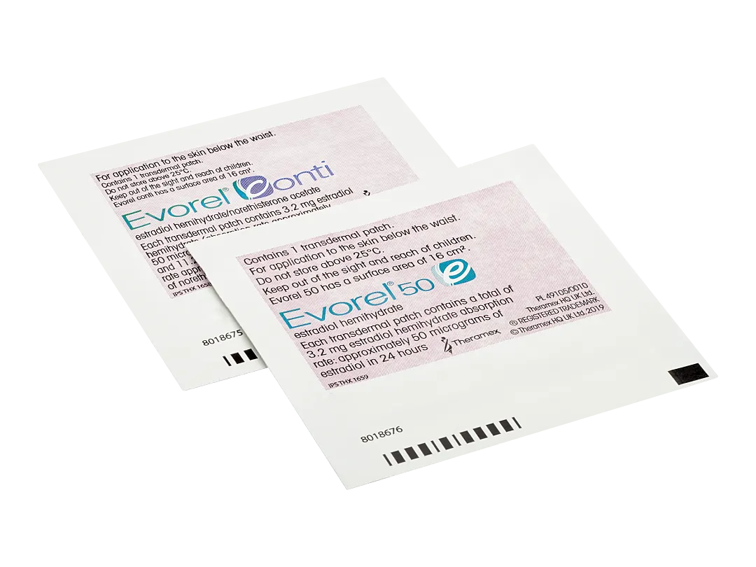 There are two types of patches in a pack: Evorel 50 and Evorel Conti. Evorel 50 is taken in the first two weeks of your cycle and contains oestrogen only.